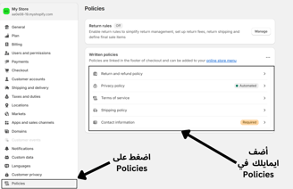 تأكد من مراجعة وتحديث معلومات الاتصال الخاصة بك في صفحات السياسات مثل سياسة الخصوصية والشروط والأحكام وسياسة الاسترجاع. ستجد ما تحتاج تغييره بالأحمر